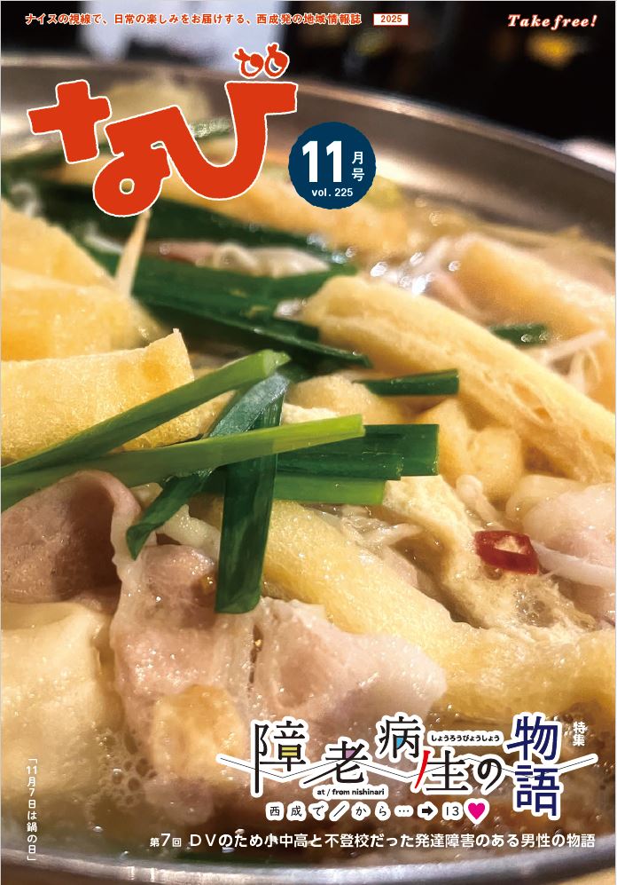 ・特集 障老病生の物語 ― 第7回 DVのため小中高と不登校だった発達障害のある男性の物語 ・にしなりもん ― 生クリーム好きにはたまらない!「エルベドール」 ・melody of smiles ・近ツ橋 ― 吹き矢でつながりと健康を ・些事争論 ― 異国で出会った絆 ・葉っぱの吐息 ― 「サンチュの葉っぱ」の巻 ・皮算用胸算用 ・いい湯かげん ― あのガザを大阪に置き換えて ・松向寺さんの心の時間 ・ワタシの1枚 ― はじめの1枚